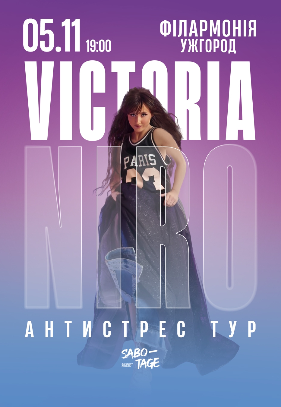 Зустрінемось, щоб заспівати разом щирі й мрійливі хіти: «Питань нема, «Не знаю», «Рожеві окуляри» і ще багато пісень! Victoria NIRO — одна з найчуттєвіших голосів нової української сцени. Вона поєднує хіп-хоп і поп, та створює музику про любов, силу залишатися собою й мріяти.